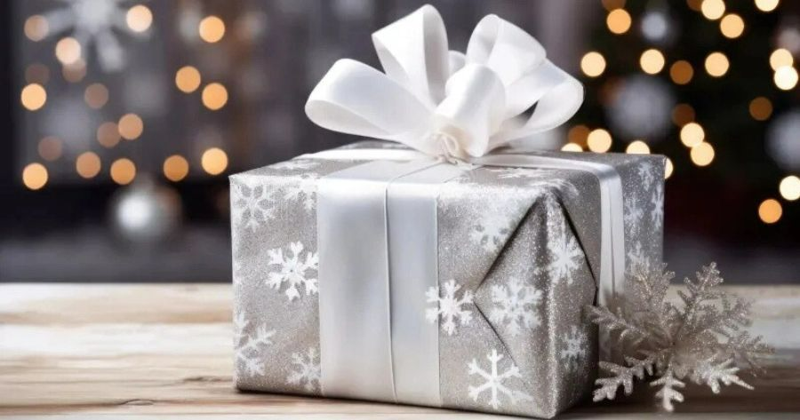A snowflake-patterned white box with a silver bow.
